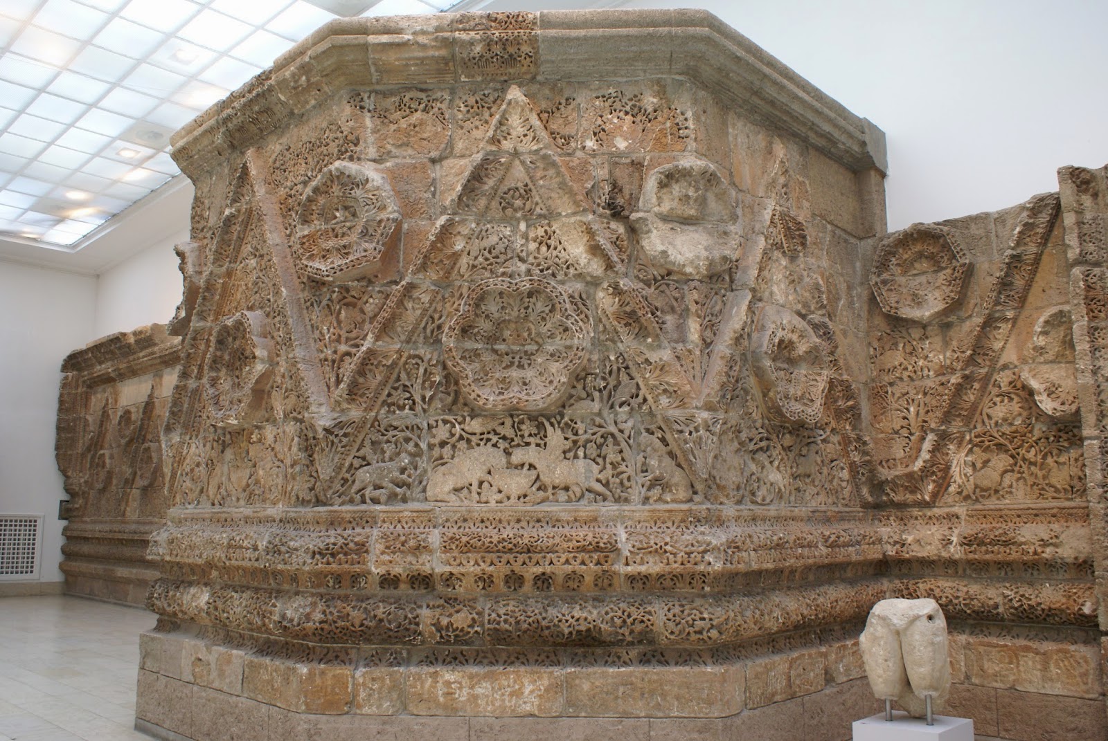Igualmente estas zonas de Siria y Palestina también dejaron un legado que va a entroncar con la cultura islámica que tiene una presencia importante en el Museo de Pérgamo. En la imagen, se muestra una pequeña parte de la monumental fachada del palacio de Mshatta. Este palacio se atribuye al califa omeya al-Walid II (743-744), quien ordenó construir un palacio en el desierto jordano al sudeste de Ammán. La obra quedó sin terminar y fue redescubierta en el siglo XIX. El sultán otomano se lo regaló al káiser alemán y se haya en este museo desde 1903.
